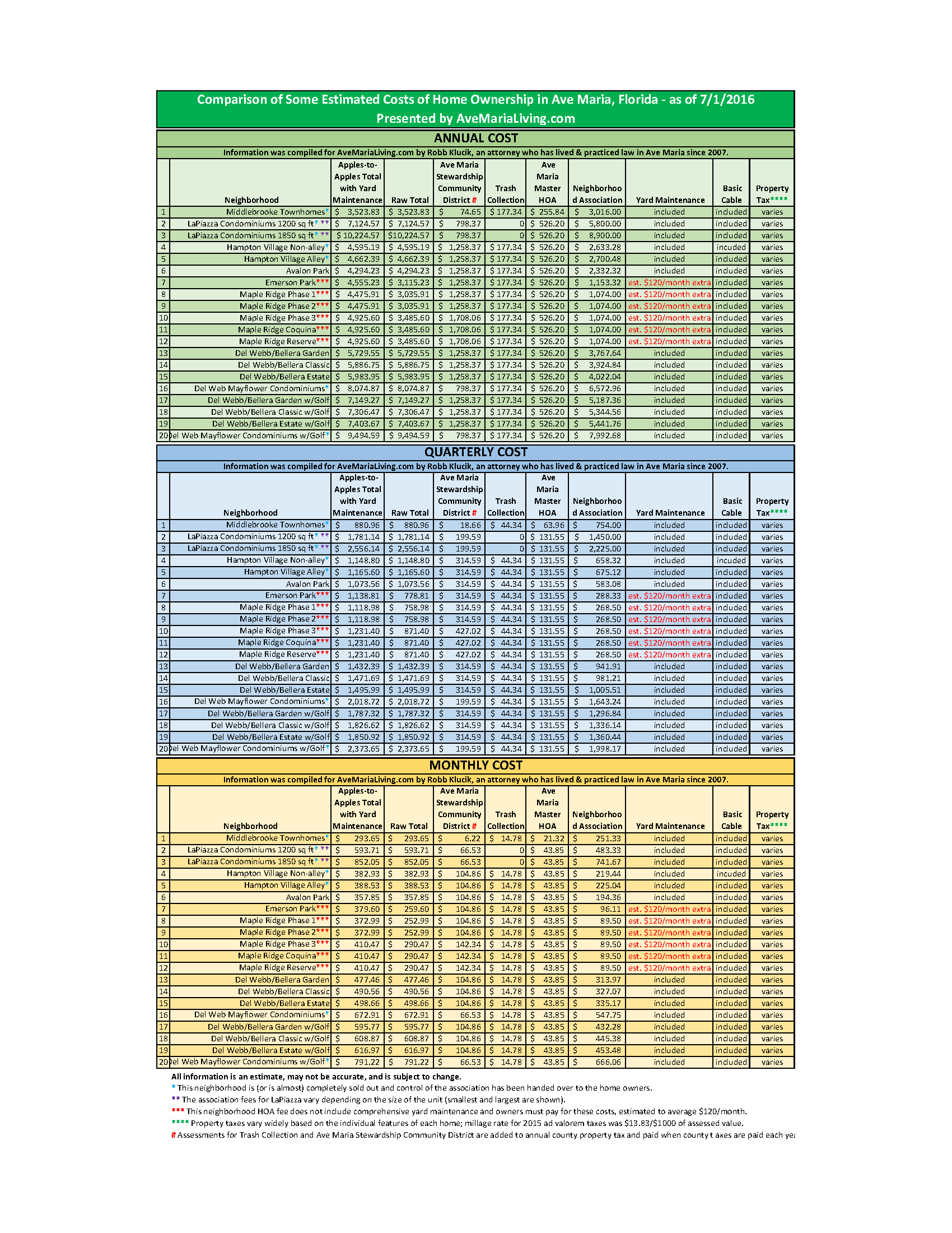 Click here for the HOA Cost Sheet PDF, and below is a graphic of the chart:
