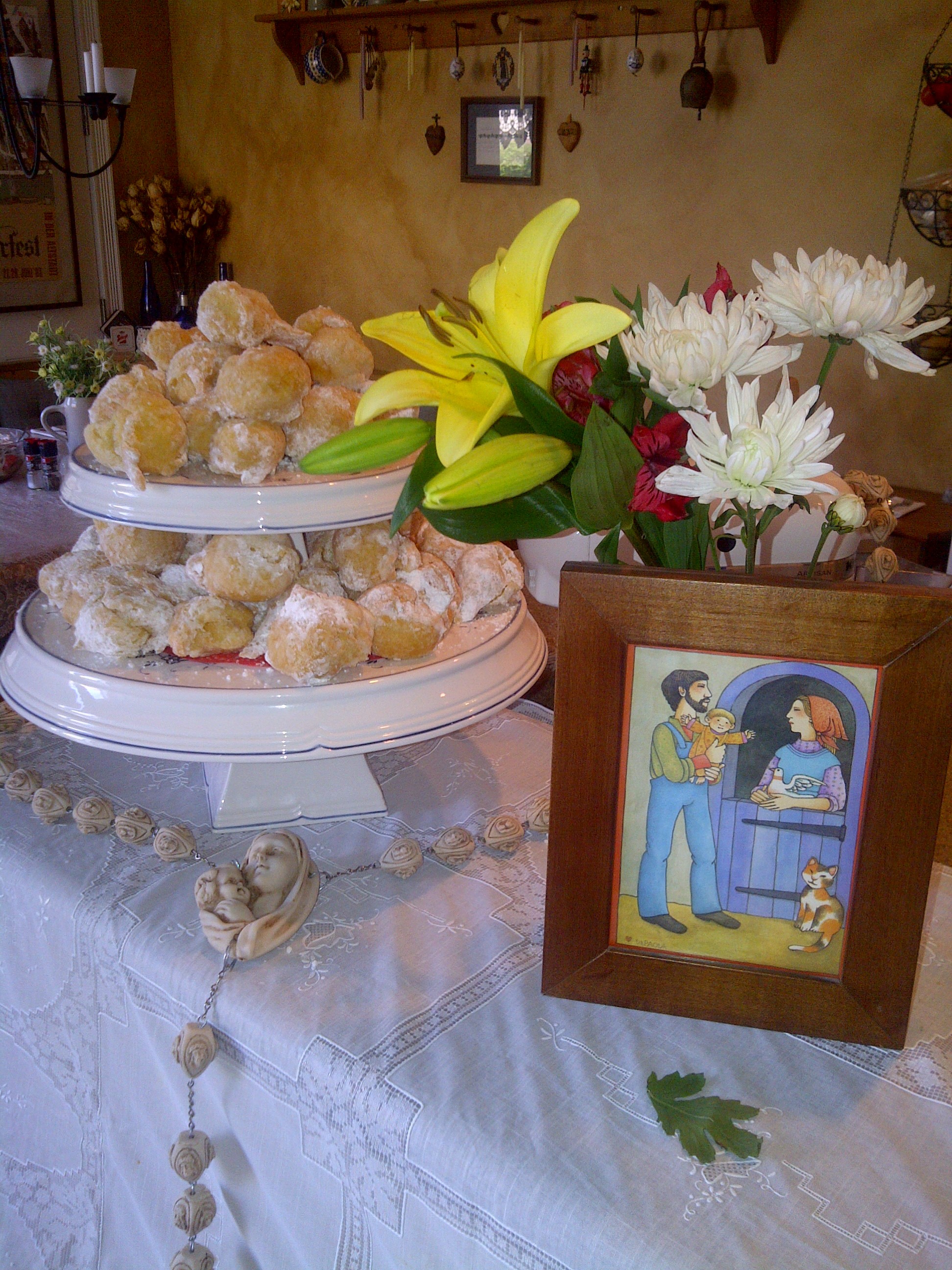 Family and friends celebrate a traditional Saint Joseph’s Day table with sfinge (also known as zeppoli), St. Joseph bread, oranges, fennel, eggplant, fish, artichokes and pasta