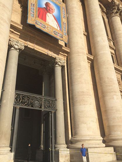 Pope John Paul II canonization banner over the entrance to St. Peter’s Basilica with John Paul Allan standing under it at St. Peter’s Basilica.