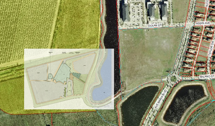 According to the clues provided in the Ave Herald, we can overlay the site plan onto the official county map of Ave Maria to see exactly where AMU plans to build the performing arts center and Mother Teresa museum: